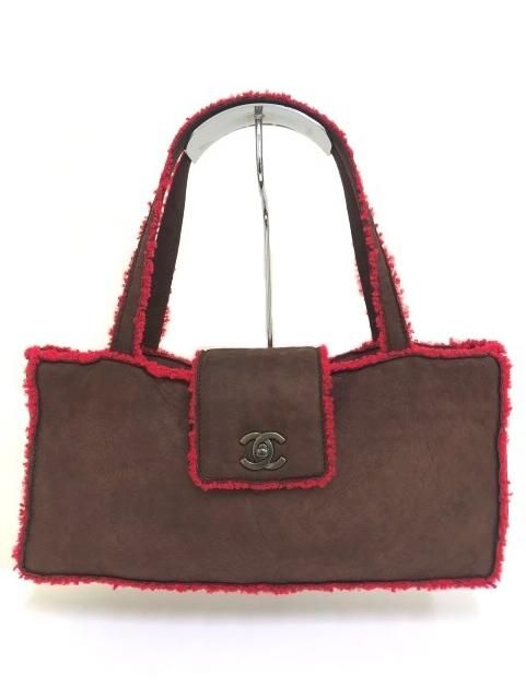 ダークブラウン×赤 ムートン素材の可愛いハンドバッグ。
