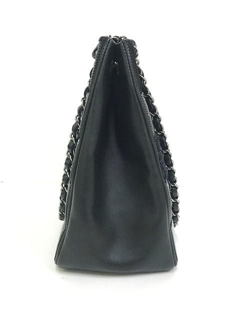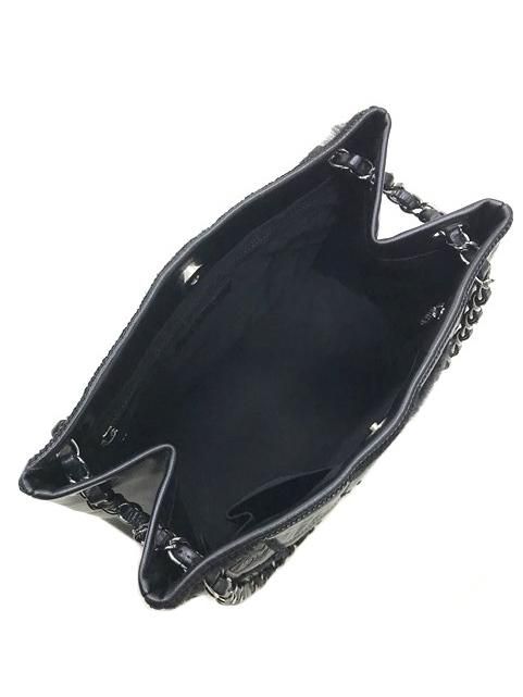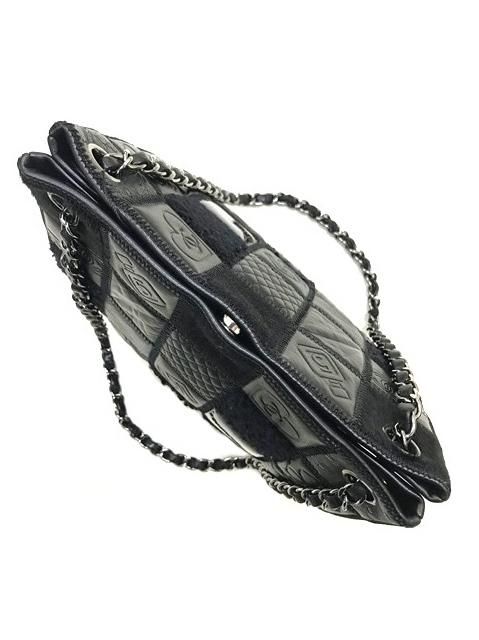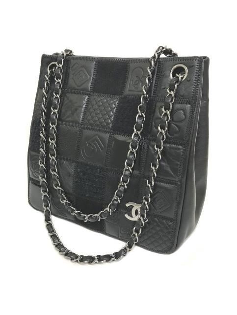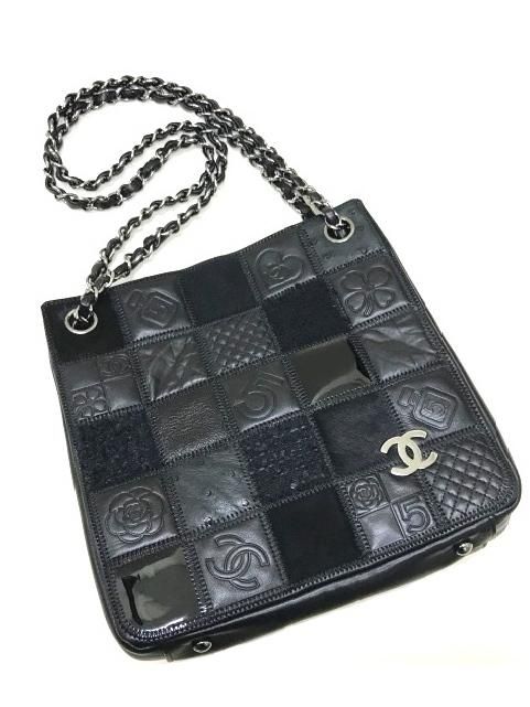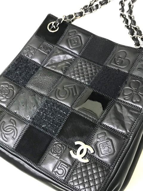 様々な素材がパッチワークされたデザインのチェーンバッグ。
