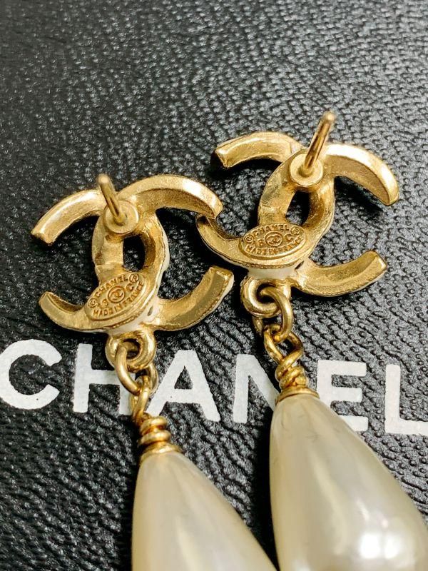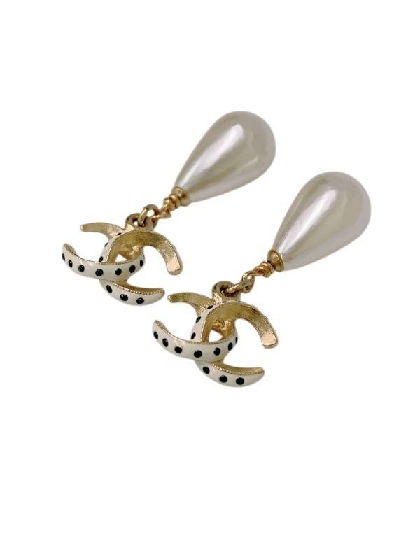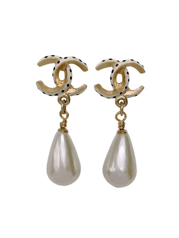 白×黒ドット柄のココマークにパールがぶら下がった可愛いピアス